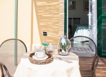 La camera ha l’ingresso indipendente; il terrazzo esterno è arredato con un ombrellone, un tavolino e due poltroncine dove trascorrere piacevolmente momenti di relax avvolti in un’atmosfera tranquilla e rilassante.
